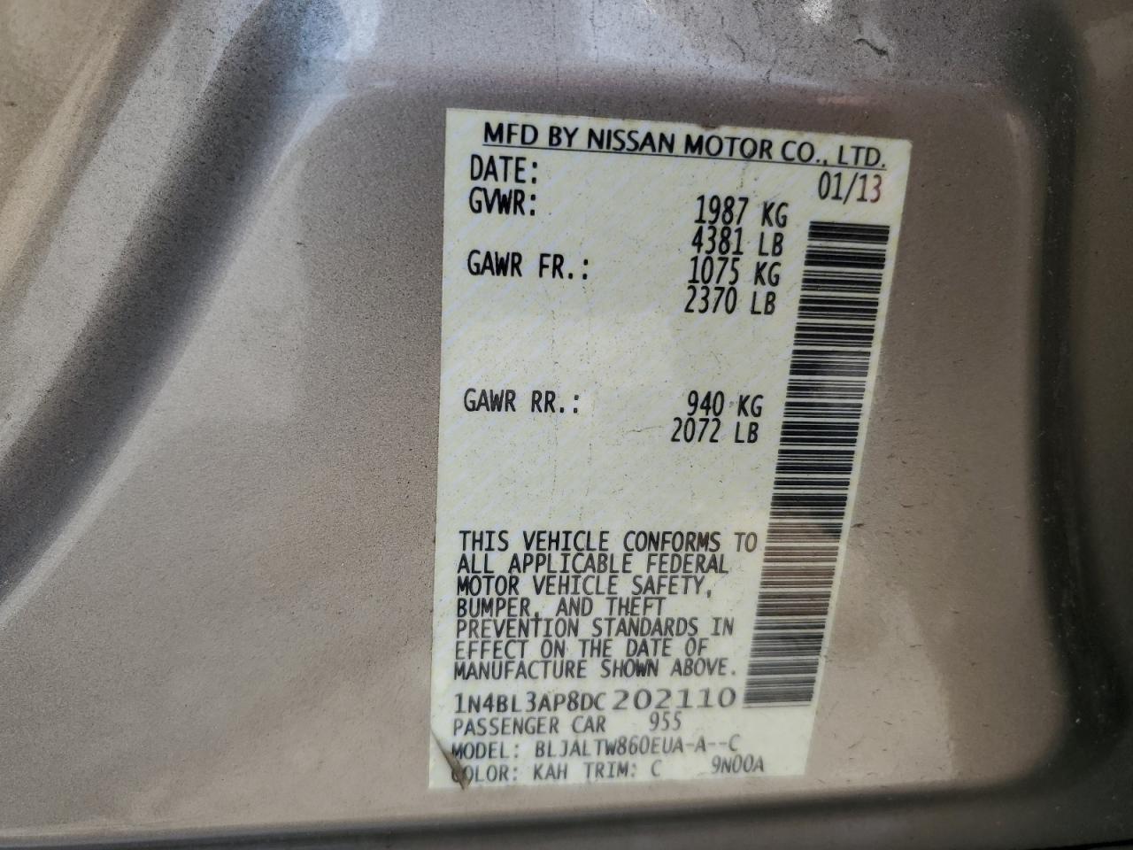 Колір БежевийЦиліндри 6VIN 1N4BL3AP8DC202110Стан НевідомоУшкодження Передня або задня