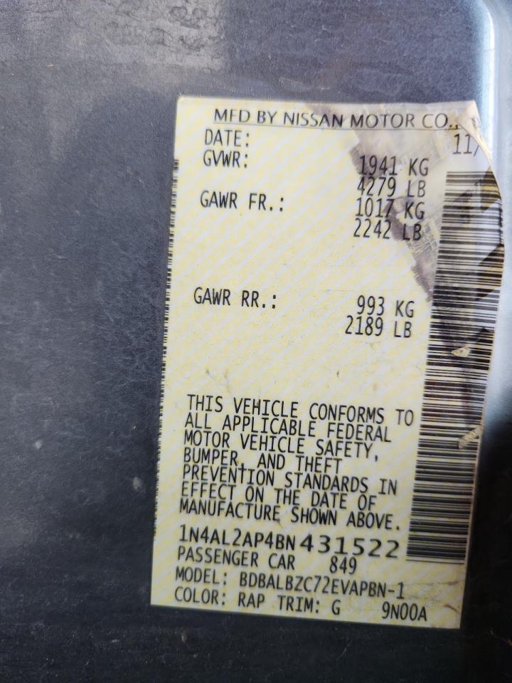 Колір СірийЦиліндри 4VIN 1N4AL2AP4BN431522Стан Заводиться та їде (перевірено)Ушкодження Передня або задня