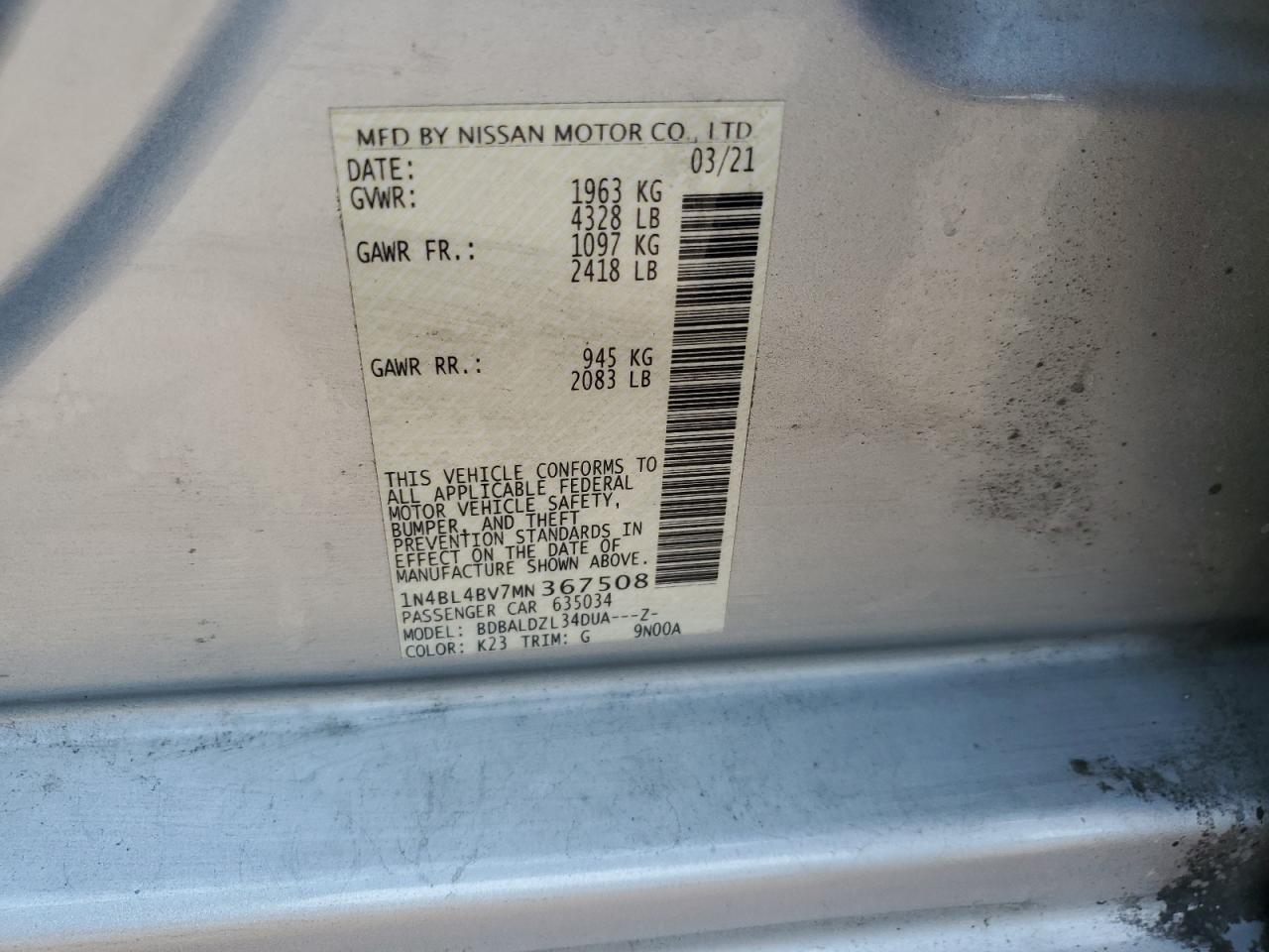 2021 NISSAN ALTIMA - 1N4BL4BV7MN367508, колір - 2 відтінки, 2.5, Бензин, із США