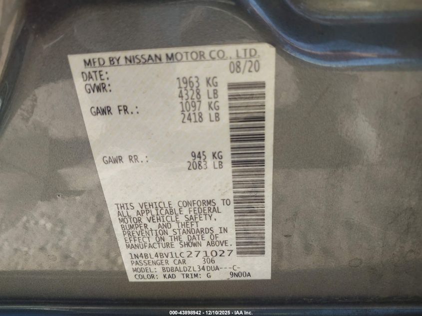 2020 NISSAN ALTIMA - 1N4BL4BV1LC271027, колір - Сірий, 2.5, Бензин, Передній привід із США