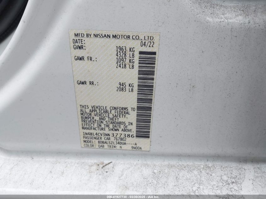 2022 NISSAN ALTIMA - 1N4BL4CV3NN377386, колір - Білий, 2.5, Бензин, Передній привід із США