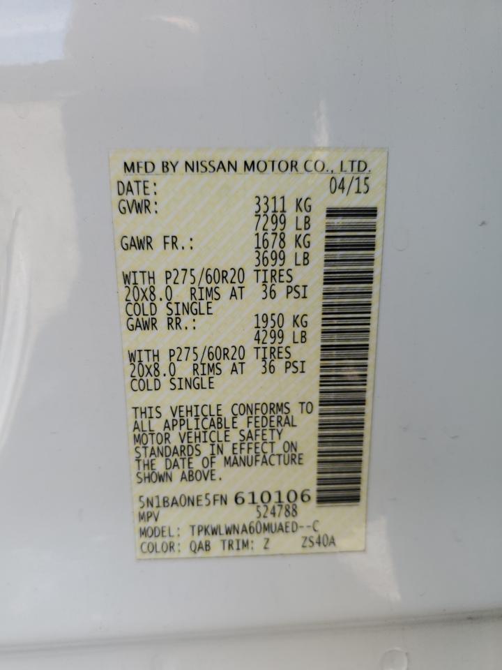 2015 NISSAN ARMADA - 5N1BA0NE5FN610106, колір - Білий, 5.6, Бензин, 4x4 з заднім приводом із США