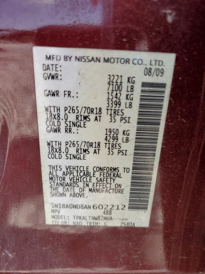 2010 NISSAN ARMADA - 5N1BA0ND8AN602212, колір - Бургундія, 5.6, Бензин, Задній привід із США