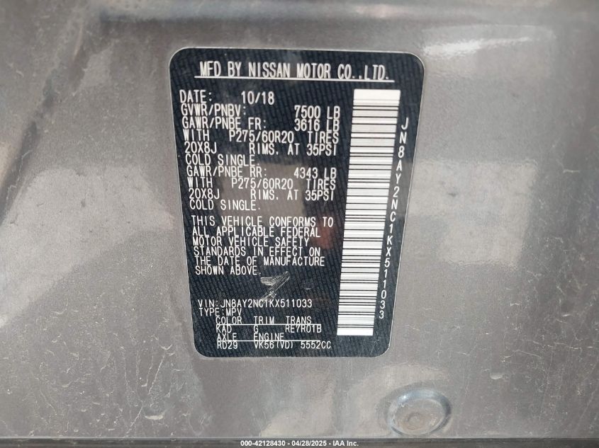 2019 NISSAN ARMADA - JN8AY2NC1KX511033, колір - Сірий, 5.6, Бензин, Повний привід із США