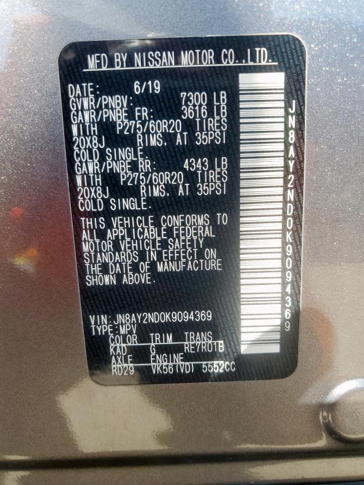 2019 NISSAN ARMADA - JN8AY2ND0K9094369, колір - Сірий, 5.6, Бензин, Задній привід із США