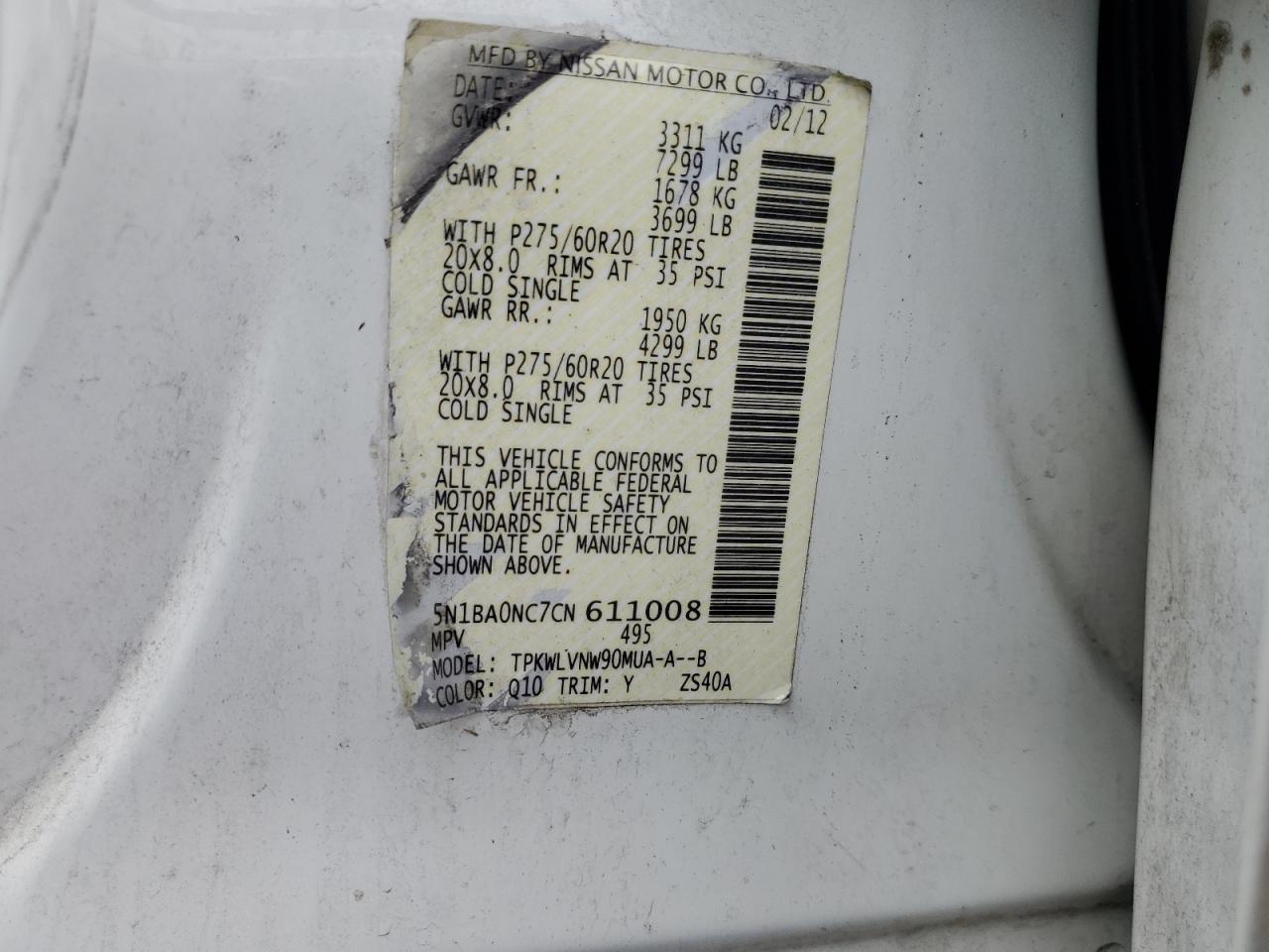 2012 NISSAN ARMADA - 5N1BA0NC7CN611008, колір - Білий, 5.6, Бензин, 4x4 з заднім приводом із США