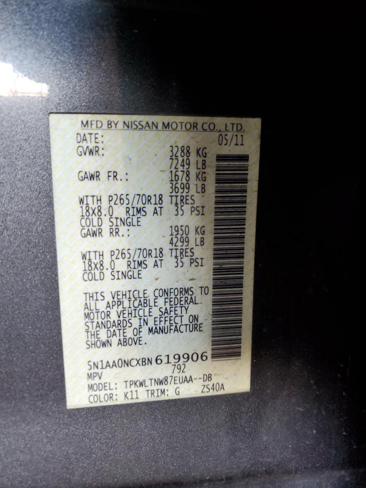 2011 NISSAN ARMADA - 5N1AA0NCXBN619906, колір - Деревне вугілля, 5.6, Бензин, 4x4 з заднім приводом із США