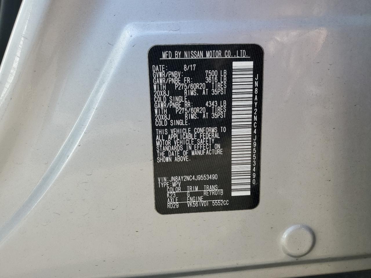 Колір СрібнийЦиліндри 8Привід Повний привідVIN JN8AY2NC4J9553490Стан Заводиться та їде (перевірено)Ушкодження Передня або задняДата аукціона 2025-12-18