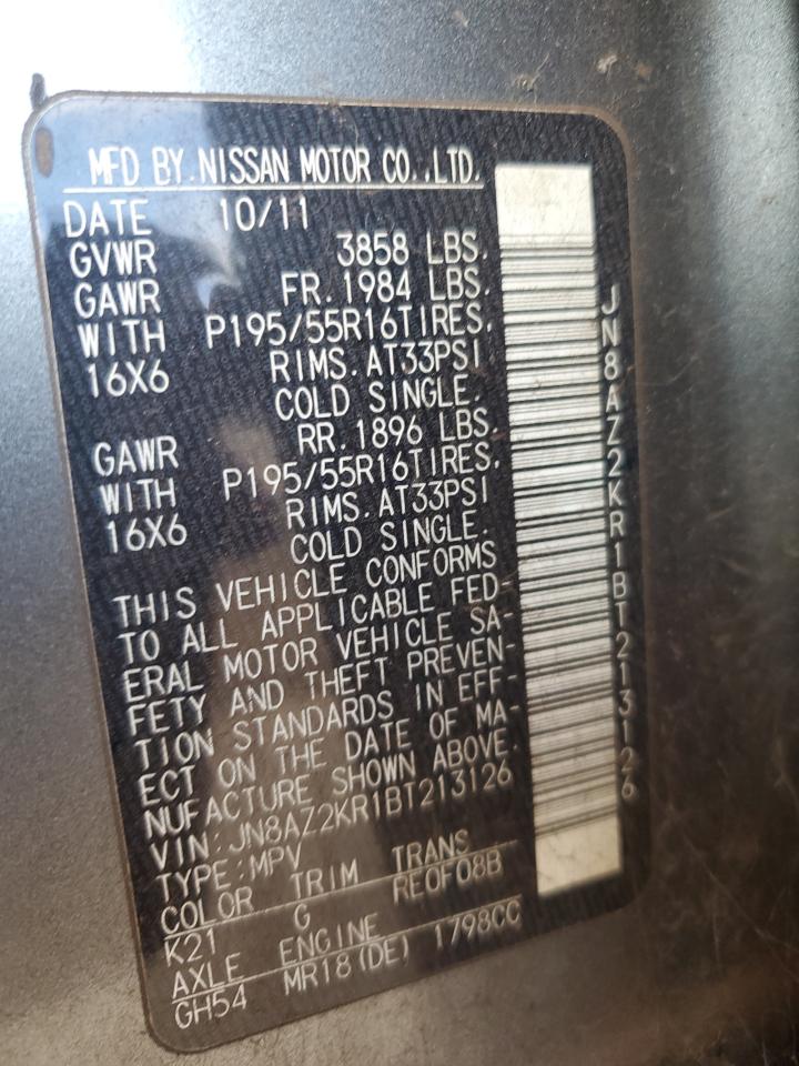 2011 NISSAN CUBE - JN8AZ2KR1BT213126, колір - Сірий, 1.8, Бензин, із США