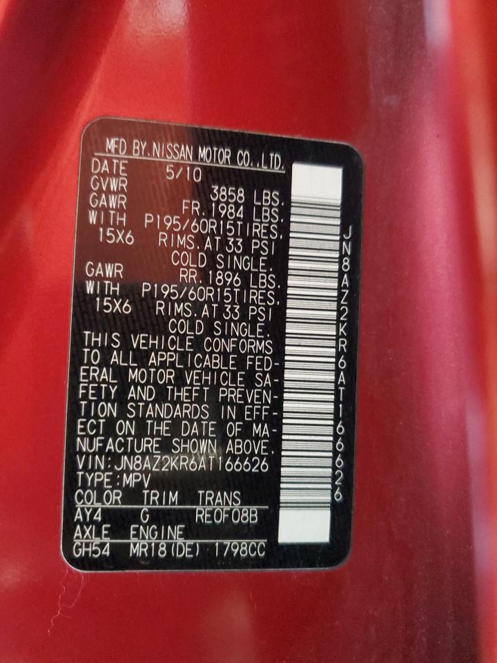 2010 NISSAN CUBE - JN8AZ2KR6AT166626, колір - Червоний, 1.8, Бензин, із США