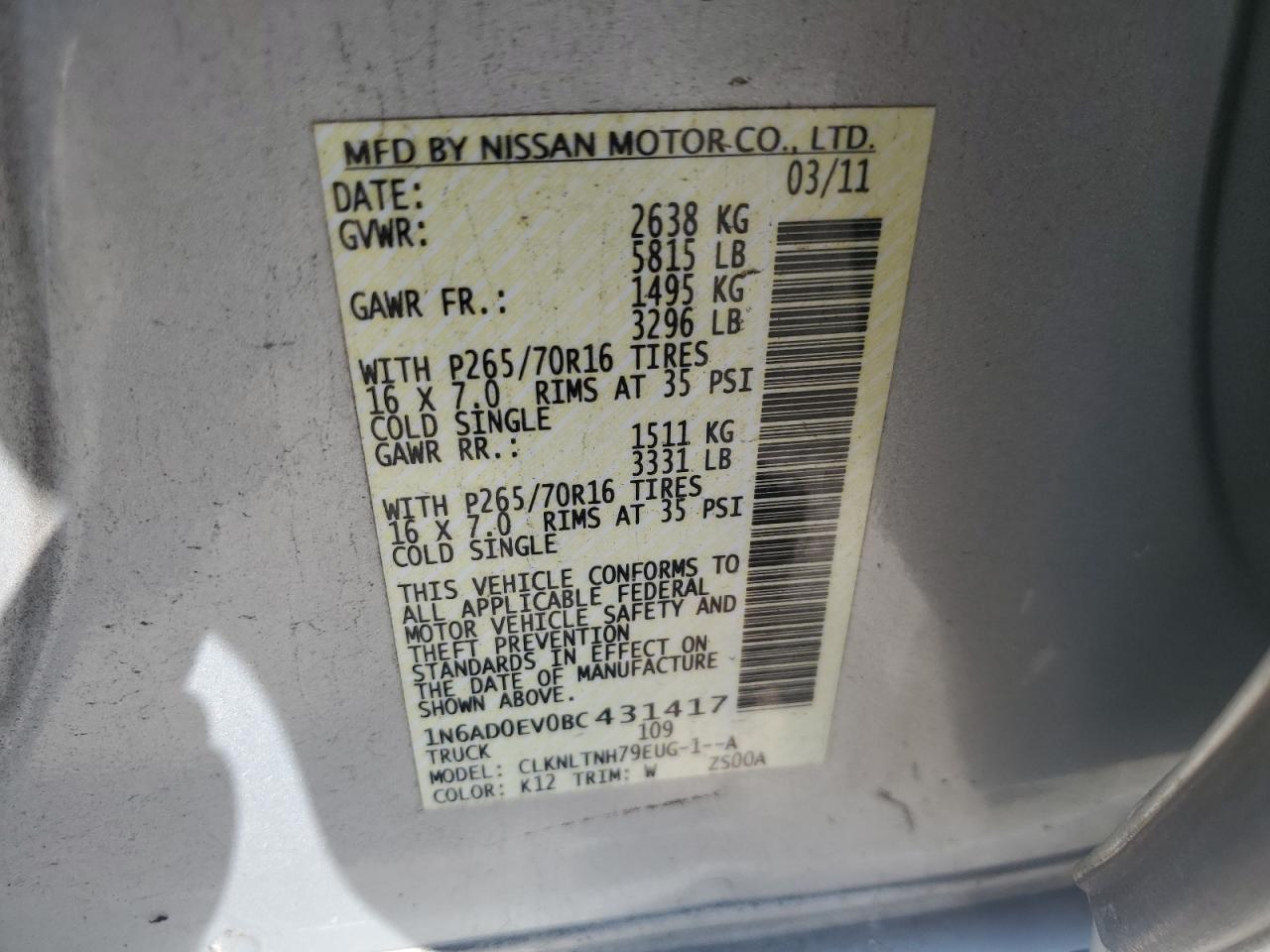 Колір СрібнийЦиліндри 6Привід 4x4 з заднім приводомVIN 1N6AD0EV0BC431417Стан Заводиться та їде (перевірено)Ушкодження Передня або задняДата аукціона 2025-10-06