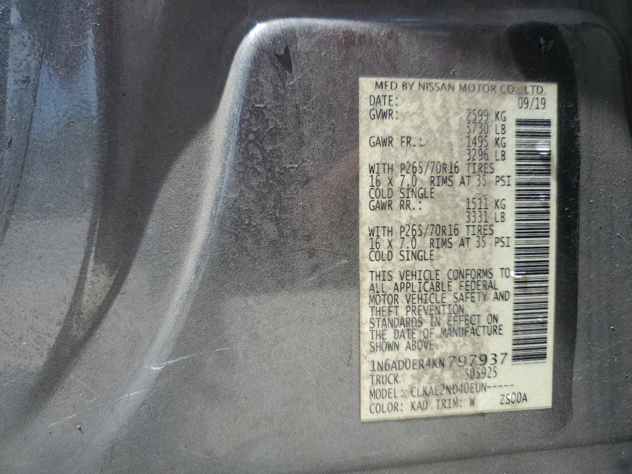 Колір СірийЦиліндри 6Привід Задній привідVIN 1N6AD0ER4KN797937Стан Заводиться та їде (перевірено)Ушкодження Передня або задняДата аукціона 2025-10-07