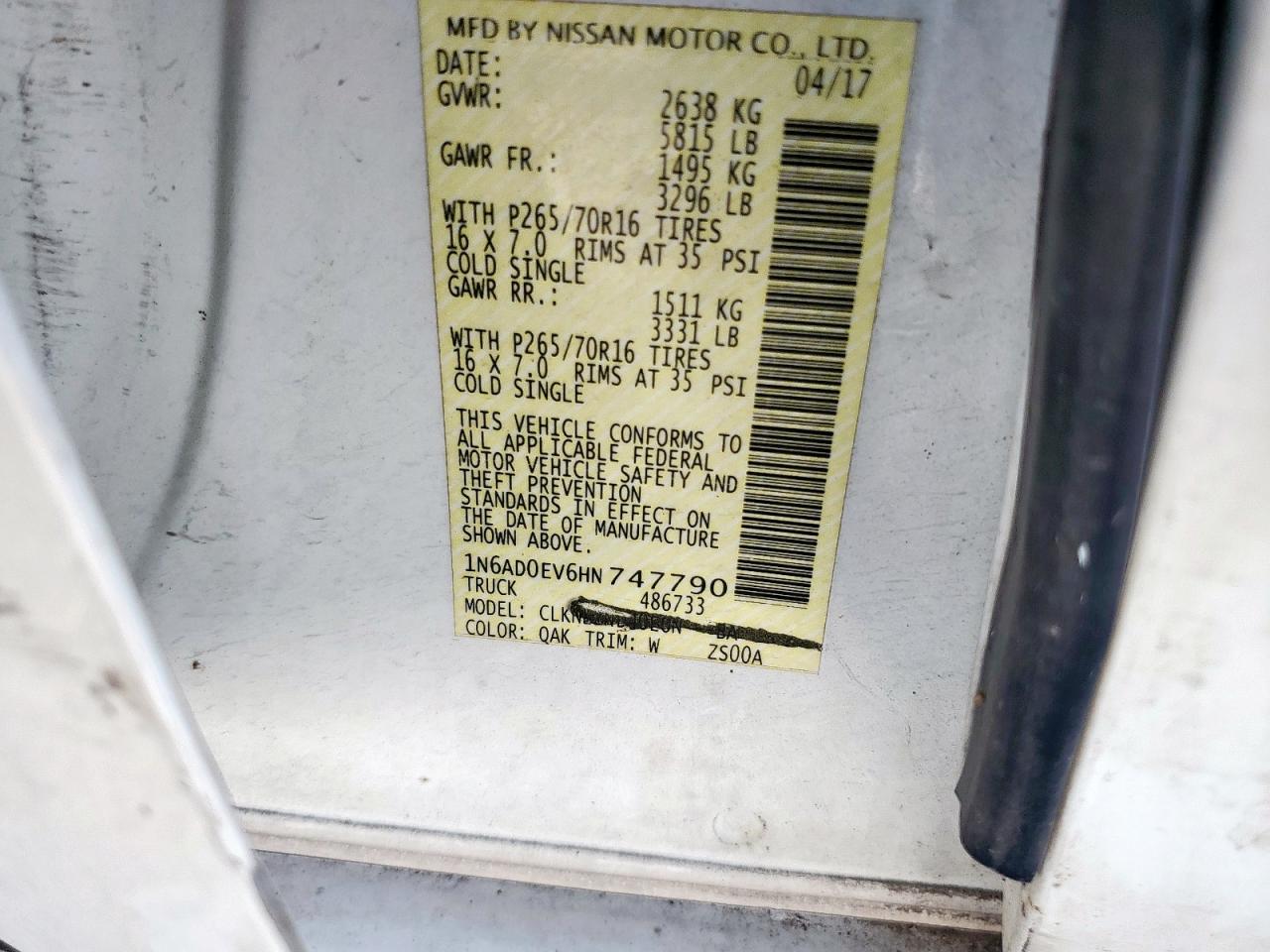 2017 NISSAN FRONTIER - 1N6AD0EV6HN747790, колір - Білий, 4.0, Бензин, 4x4 з заднім приводом із США