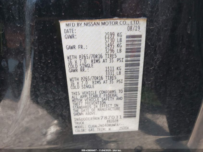 2019 NISSAN FRONTIER - 1N6DD0ER9KN787031, колір - Чорний, 4.0, Бензин, із США