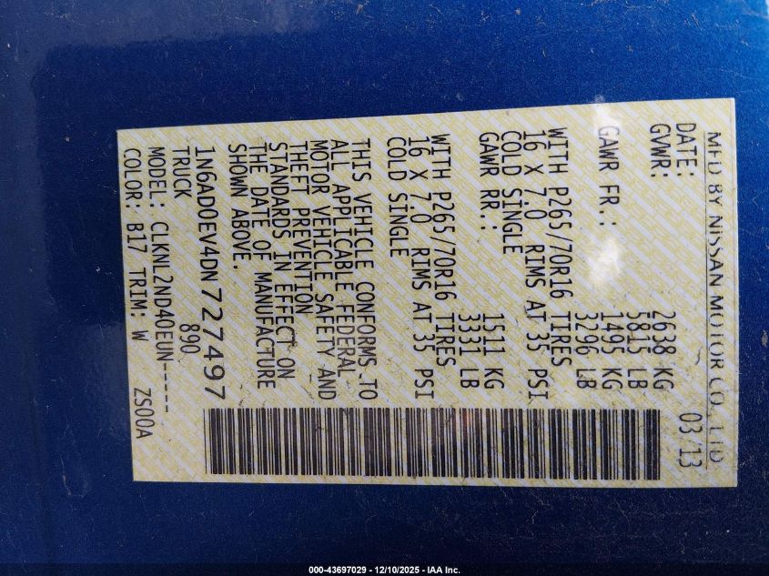 2013 NISSAN FRONTIER - 1N6AD0EV4DN727497, колір - Синій, 4.0, Бензин, Повний привід із США
