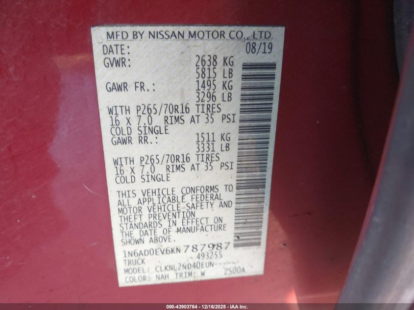2019 NISSAN FRONTIER - 1N6AD0EV6KN787987, колір - , 4.0, Бензин, Повний привід із США
