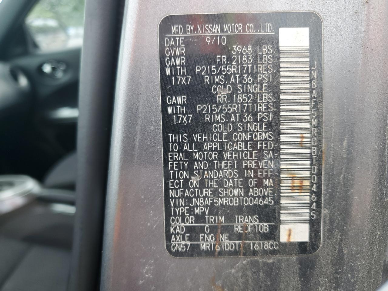 2011 NISSAN JUKE - JN8AF5MR0BT004645, колір - Сірий, 1.6, Бензин, із США
