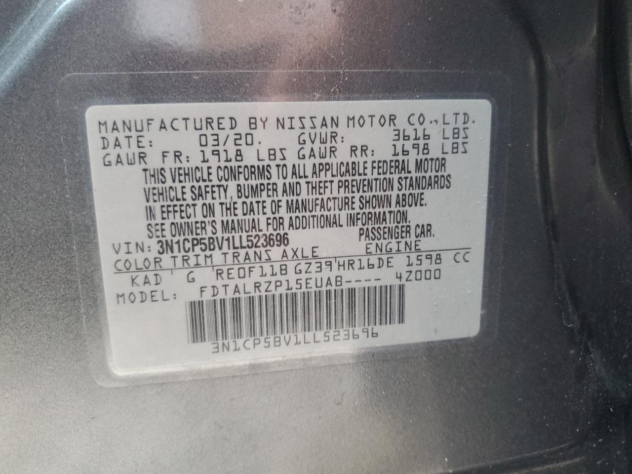 2020 NISSAN KICKS - 3N1CP5BV1LL523696, колір - Сірий, 1.6, Бензин, із США