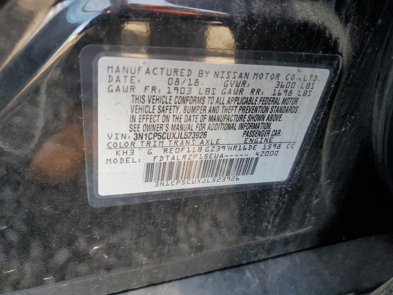 2018 NISSAN KICKS - 3N1CP5CUXJL523926, колір - Чорний, 1.6, Бензин, із США