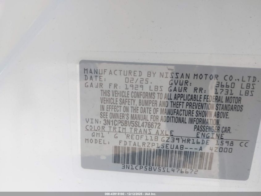 2025 NISSAN KICKS - 3N1CP5BV5SL476672, колір - Білий, 1.6, Бензин, Передній привід із США