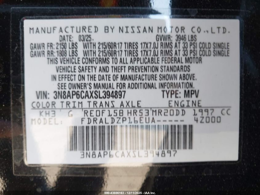 2025 NISSAN KICKS - 3N8AP6CAXSL394897, колір - Чорний, 2.0, Бензин, Передній привід із США