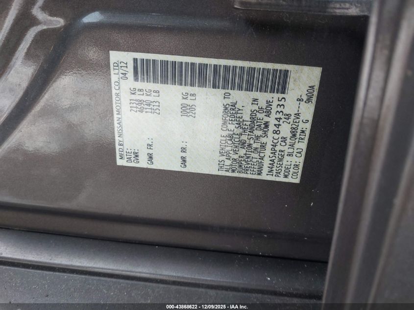 2012 NISSAN MAXIMA - 1N4AA5AP4CC844335, колір - Чорний, 3.5, Бензин, Передній привід із США