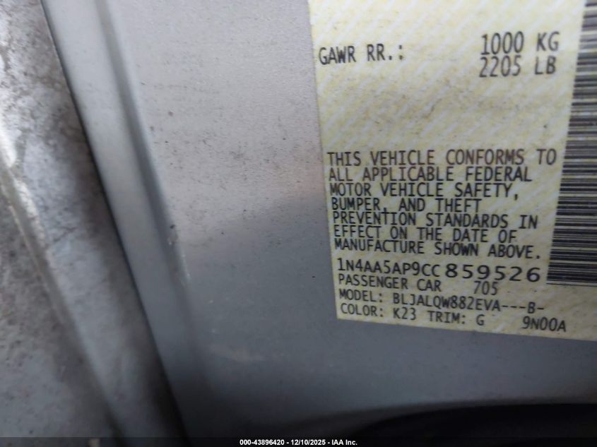 Колір СірийЦиліндри 6Привід Передній привідVIN 1N4AA5AP9CC859526Стан Заводиться та їде (перевірено)Ушкодження Передня або задня