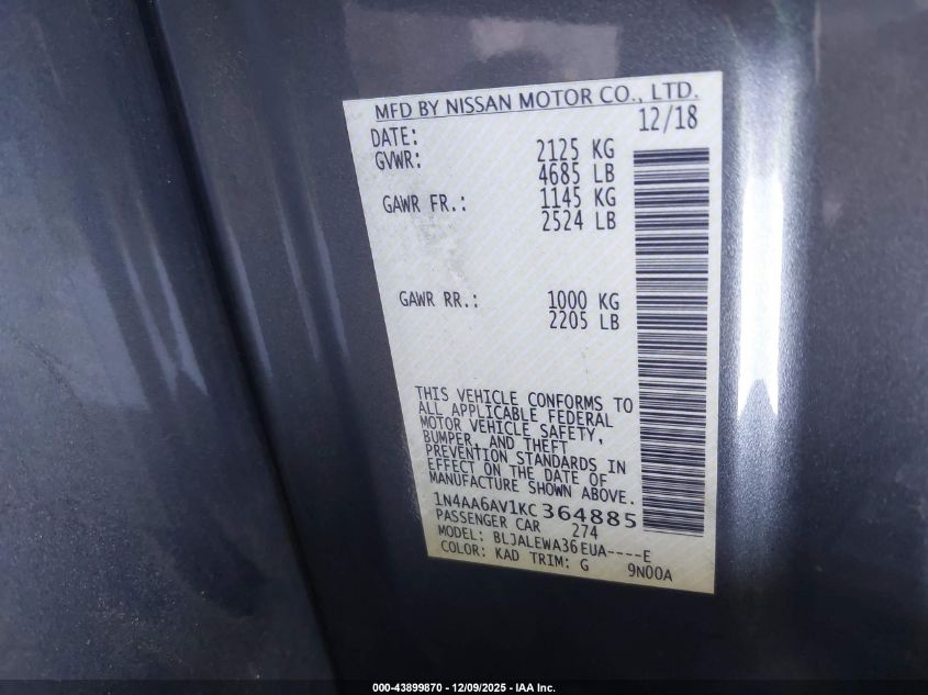 Колір СірийЦиліндри 6Привід Передній привідVIN 1N4AA6AV1KC364885Стан СтаціонарноУшкодження Передня і задня