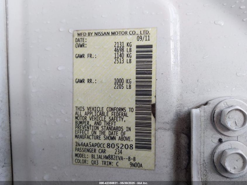 Колір БілийЦиліндри 6Привід Передній привідVIN 1N4AA5AP0CC805208Стан СтаціонарноУшкодження Вандалізм