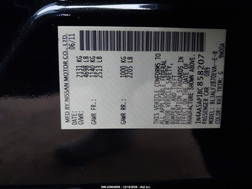 2011 NISSAN MAXIMA - 1N4AA5AP1BC858207, колір - Чорний, 3.5, Бензин, Передній привід із США