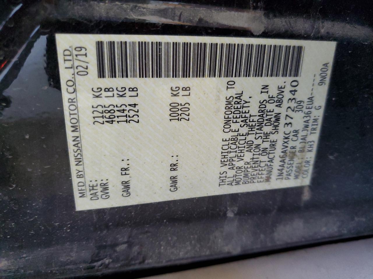Колір ЧорнийЦиліндри 6VIN 1N4AA6AVXKC372340Стан Заводиться та їде (перевірено)Ушкодження Передня або задня