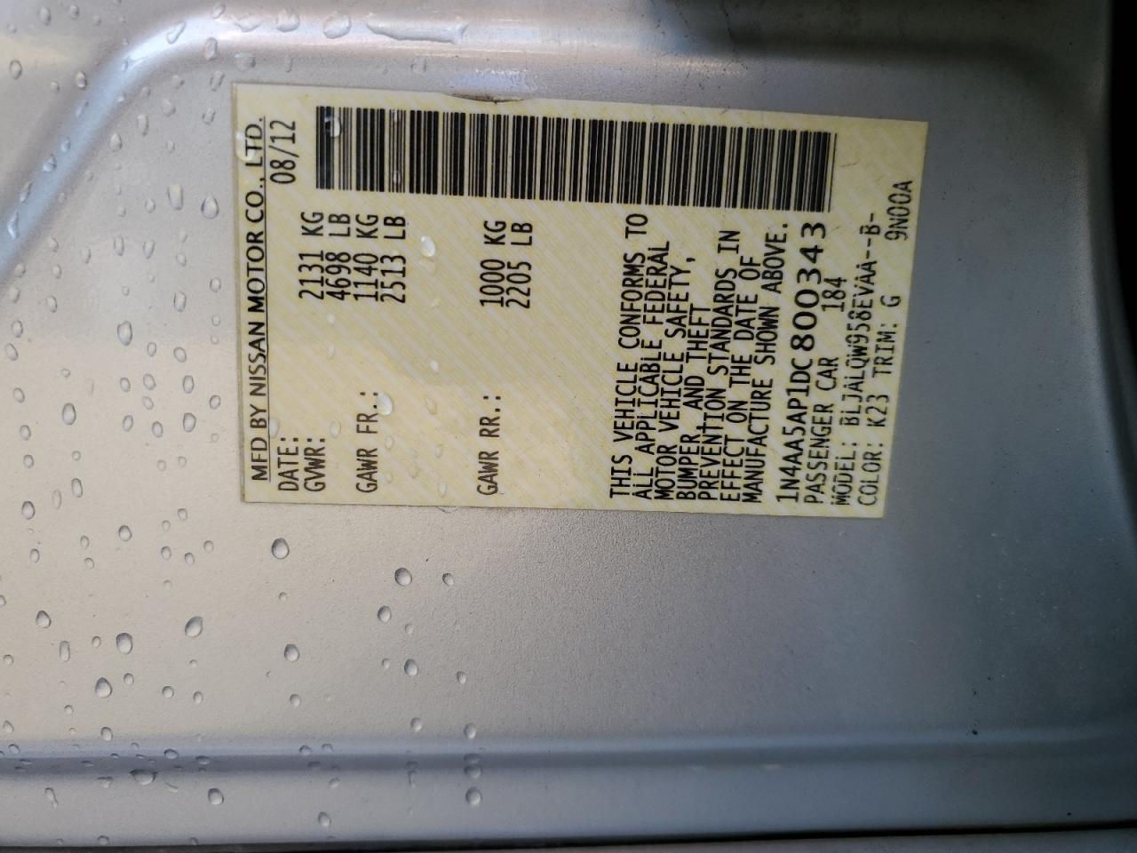 Колір СрібнийЦиліндри 6VIN 1N4AA5AP1DC800343Стан НевідомоУшкодження Передня або задняДата аукціона 2025-10-07