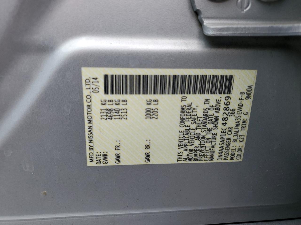 Колір СрібнийЦиліндри 6VIN 1N4AA5AP1EC482869Стан Заводиться та їде (перевірено)Ушкодження ЗадняДата аукціона 2025-10-06