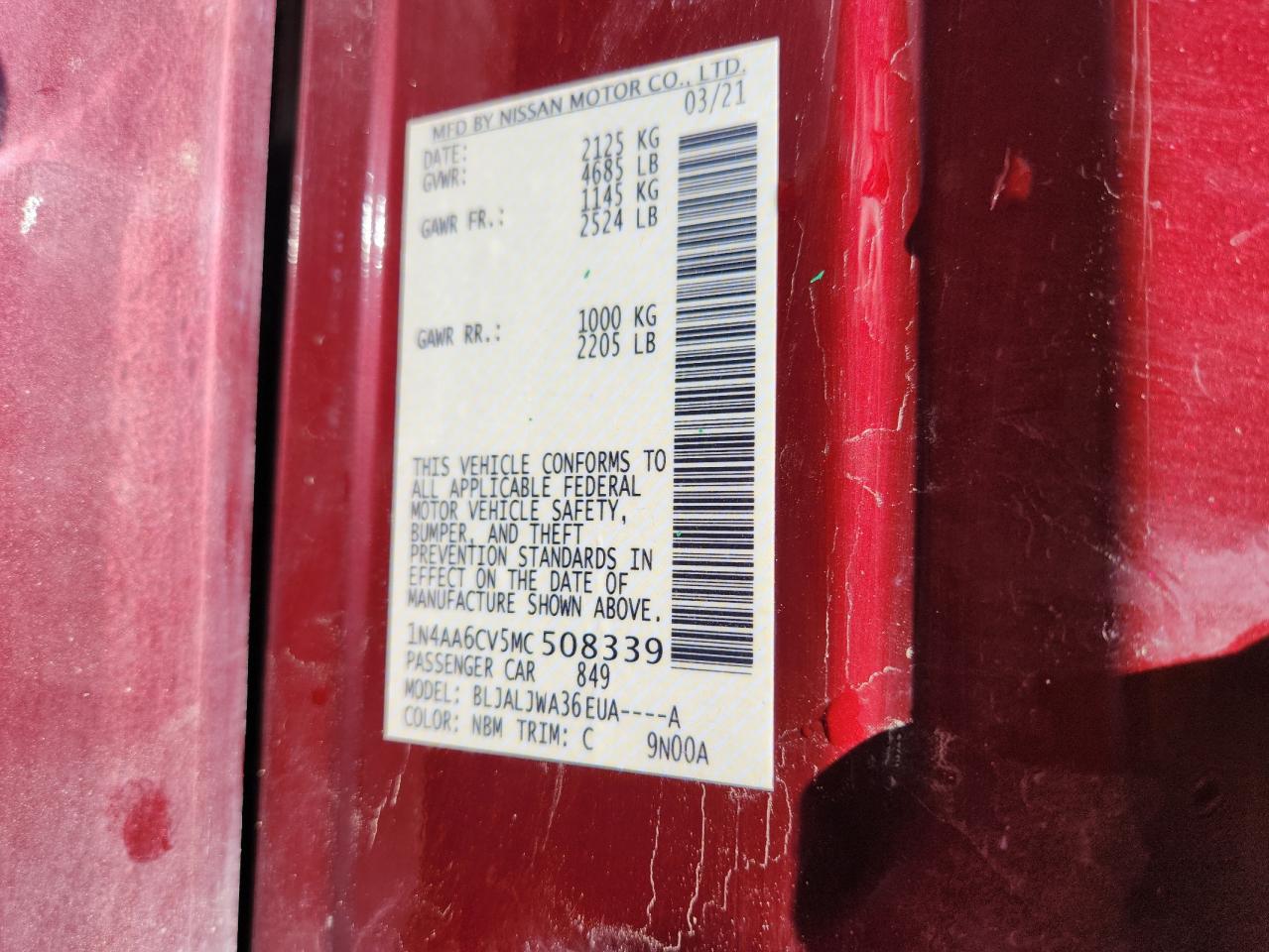 2021 NISSAN MAXIMA - 1N4AA6CV5MC508339, колір - Бургундія, 3.5, Бензин, із США