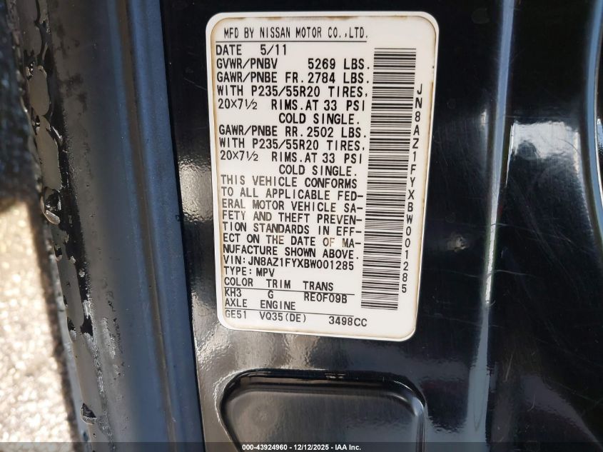 Колір ЧорнийЦиліндри 6Привід Повний привідVIN JN8AZ1FYXBW001285Стан Заводиться та їде (перевірено)Ушкодження Звичайний знос