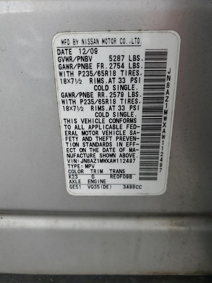2010 NISSAN MURANO - JN8AZ1MWXAW112497, колір - Срібний, 3.5, Бензин, Повний привід із США