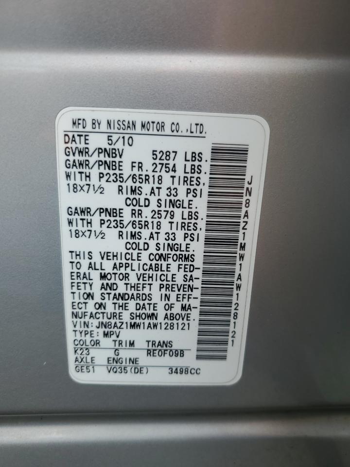 2010 NISSAN MURANO - JN8AZ1MW1AW128121, колір - Срібний, 3.5, Бензин, Повний привід із США