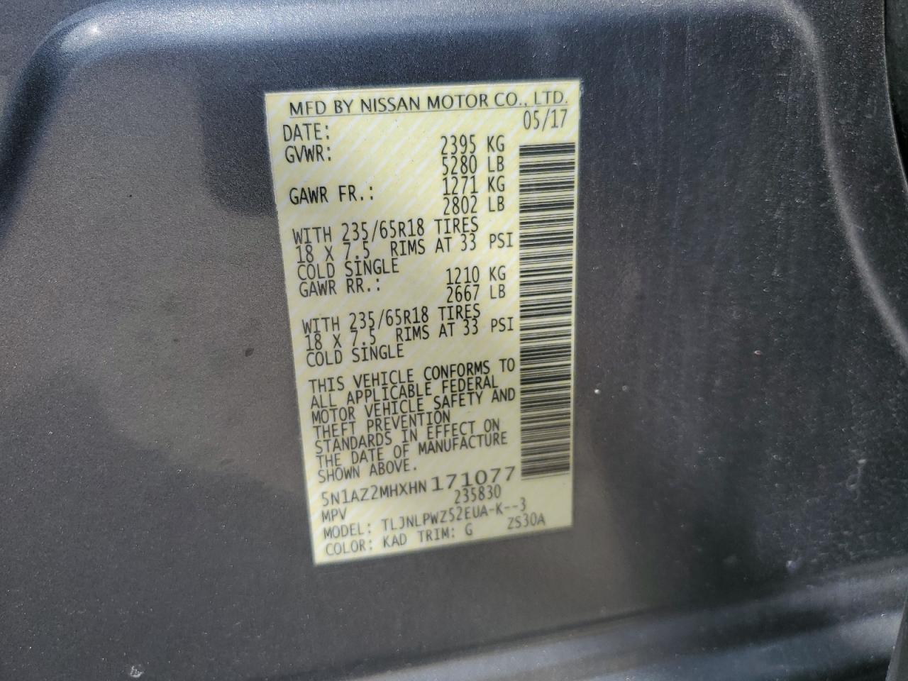Колір СірийЦиліндри 6Привід Повний привідVIN 5N1AZ2MHXHN171077Стан Заводиться та їде (перевірено)Ушкодження Незначні