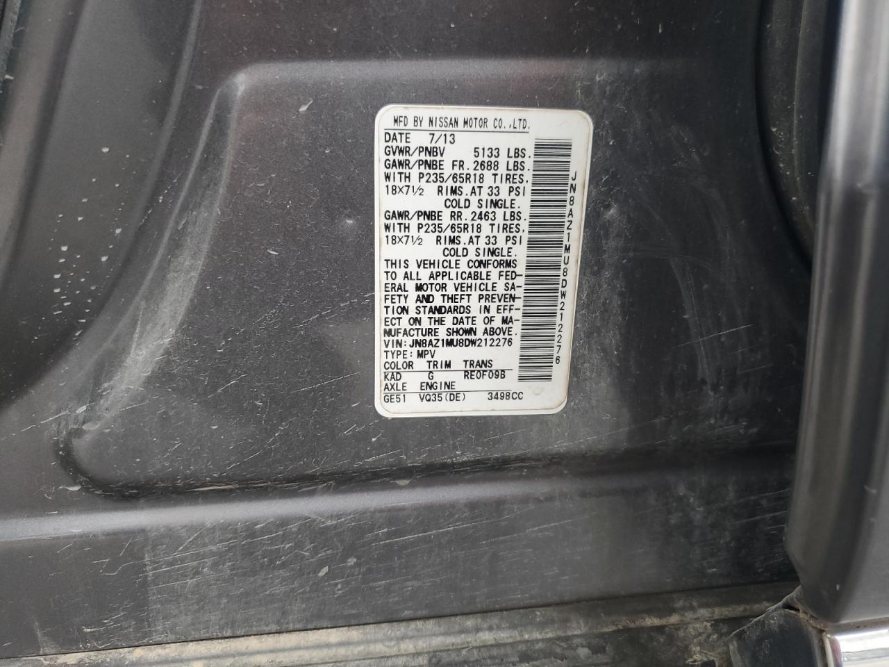 2013 NISSAN MURANO - JN8AZ1MU8DW212276, колір - Сірий, 3.5, Бензин, із США