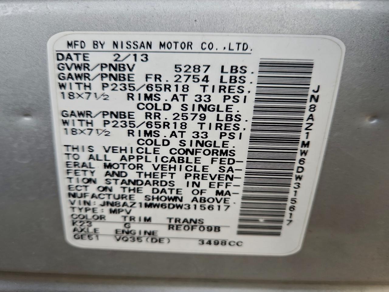 Колір СрібнийЦиліндри 6Привід Повний привідVIN JN8AZ1MW6DW315617Стан Заводиться та їде (перевірено)Ушкодження Передня або задня