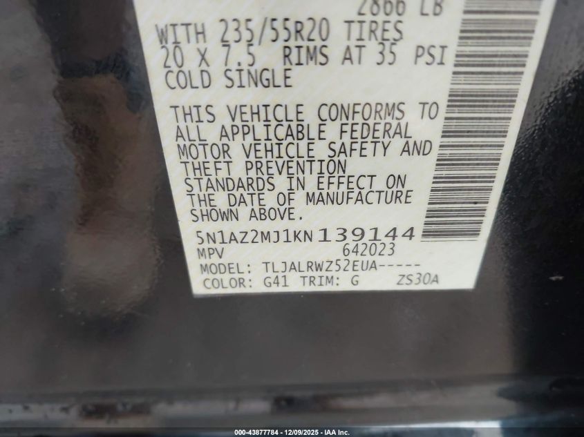 2019 NISSAN MURANO - 5N1AZ2MJ1KN139144, колір - Чорний, 3.5, Бензин, Передній привід із США