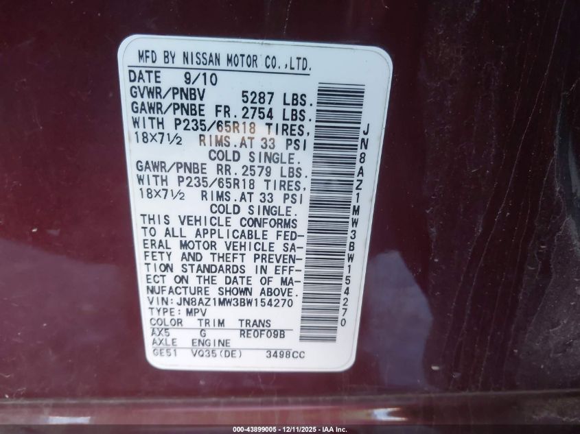 2011 NISSAN MURANO - JN8AZ1MW3BW154270, колір - Бургундія, 3.5, Бензин, Повний привід із США