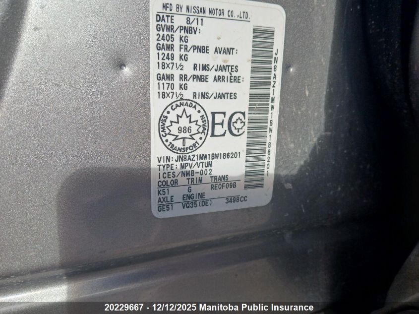 2011 NISSAN MURANO - JN8AZ1MW1BW186201, колір - Сірий, , Бензин, Повний привід із США