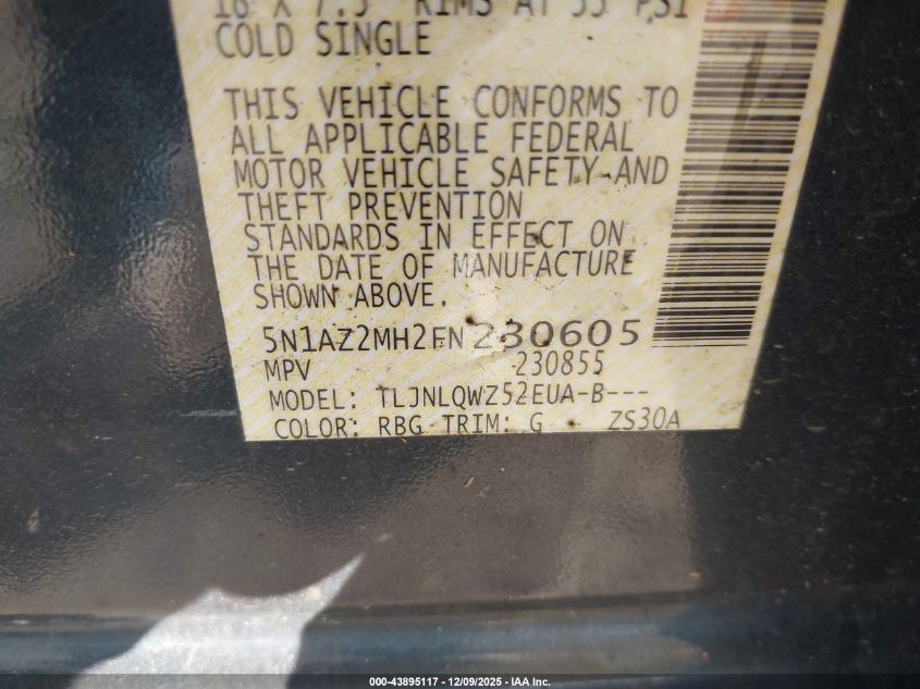 Колір СинійЦиліндри 6Привід Повний привідVIN 5N1AZ2MH2FN230605Стан Заводиться та їде (перевірено)Ушкодження Передня або задня