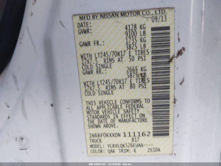 2013 NISSAN NV CARGO - 1N6BF0KXXDN111162, колір - Білий, 4.0, Бензин, Задній привід із США