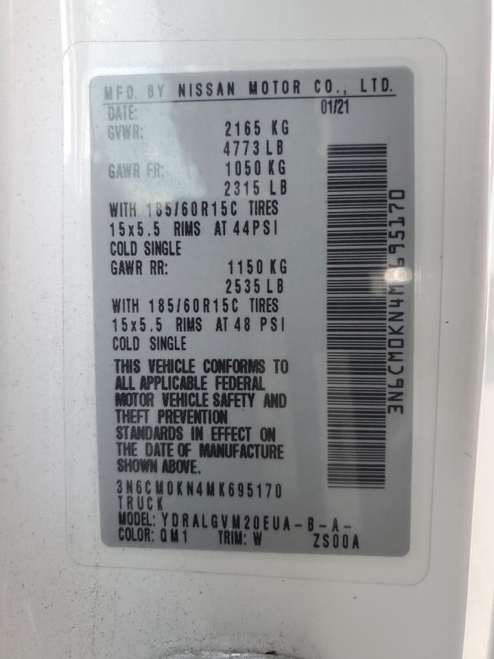 2021 NISSAN NV200 - 3N6CM0KN4MK695170, колір - Білий, 2.0, Бензин, із США