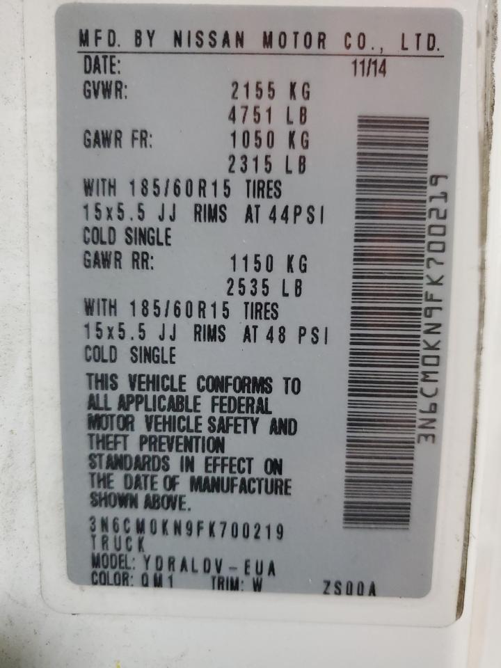 2015 NISSAN NV200 - 3N6CM0KN9FK700219, колір - Білий, 2.0, Бензин, із США