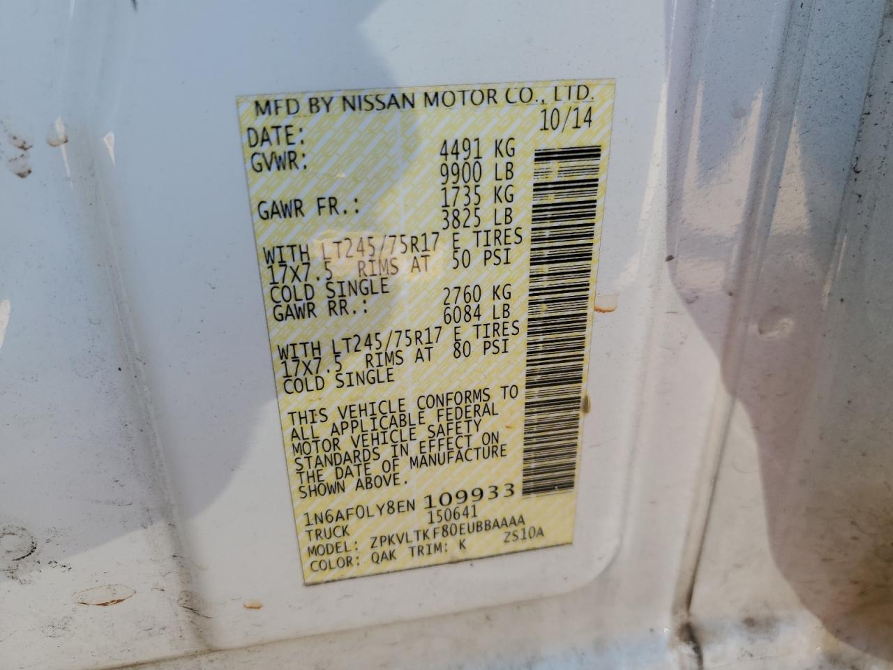 2014 NISSAN NV2500 - 1N6AF0LY8EN109933, колір - Білий, 5.6, Бензин, Задній привід із США