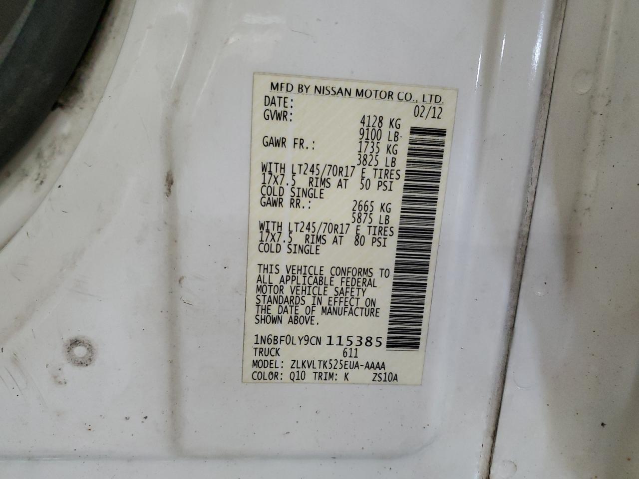 2012 NISSAN NV2500 - 1N6BF0LY9CN115385, колір - Білий, 4.0, Бензин, Задній привід із США