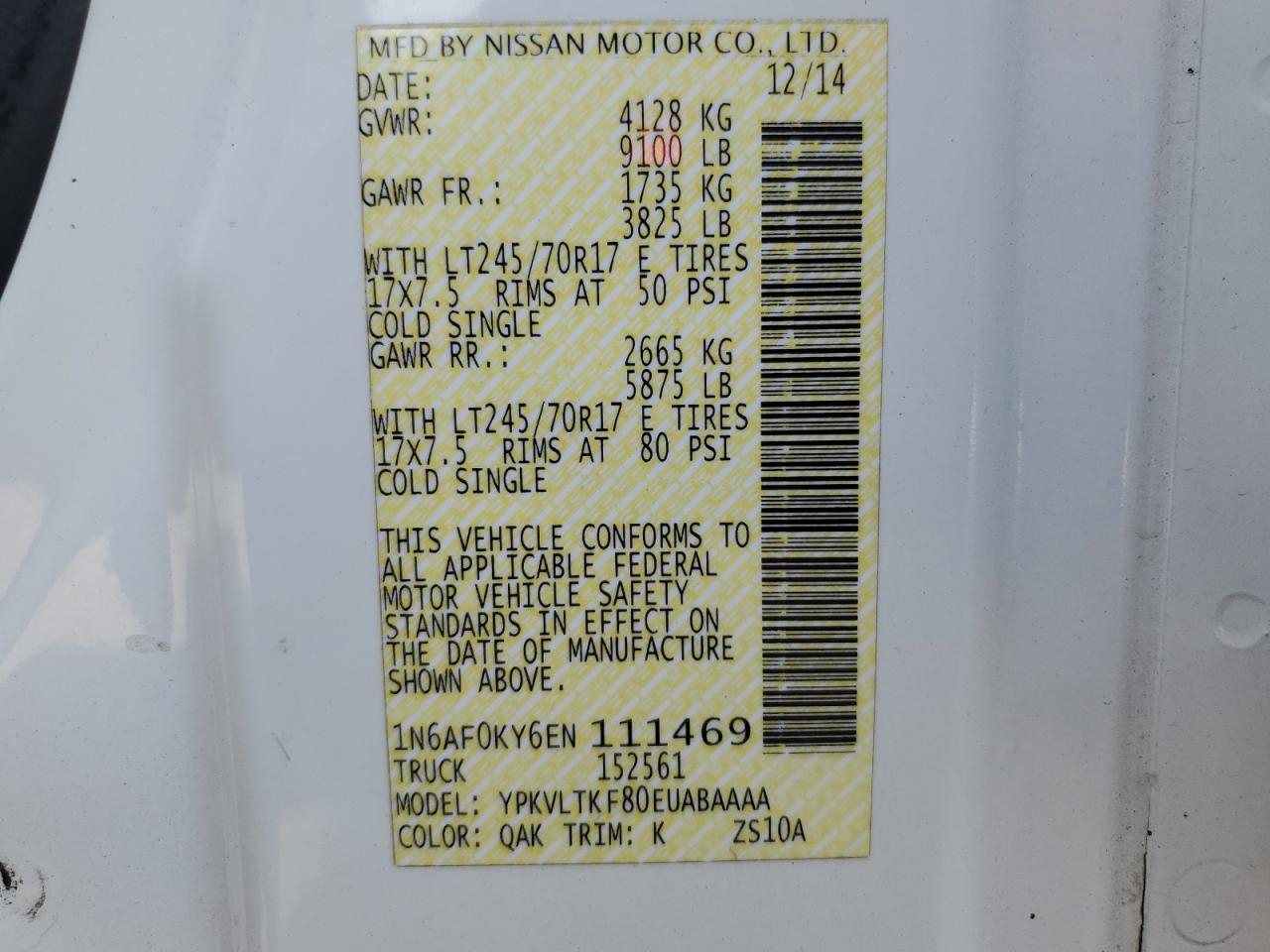 2014 NISSAN NV2500 - 1N6AF0KY6EN111469, колір - Білий, 5.6, Бензин, Задній привід із США